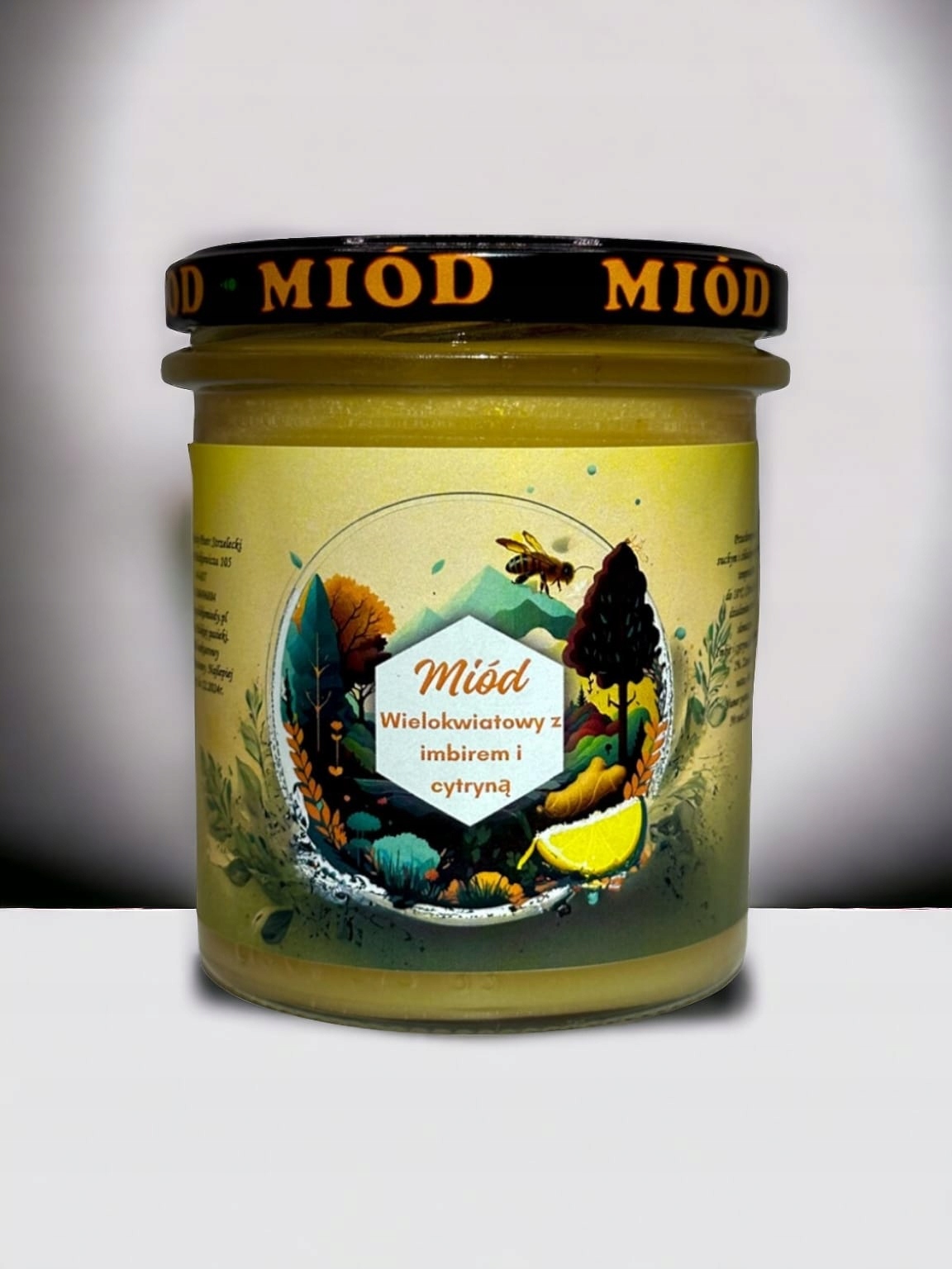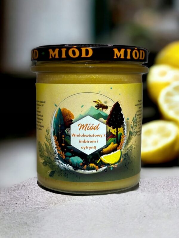 ??Odkryj Złocisty Eliksir Żywotności – Miód Wielokwiatowy z Imbirem i Cytryną 440g