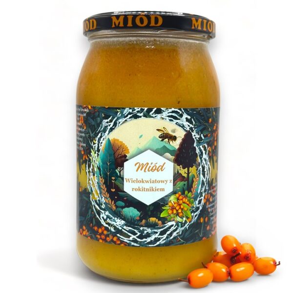✅ Miód Wielokwiatowy z Rokitnikiem 1,2 kg – połączenie naturalnego miodu z liofilizowanym rokitnikiem:
